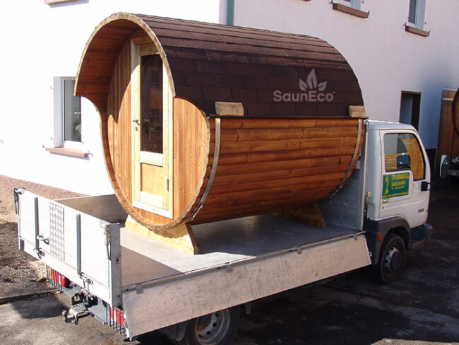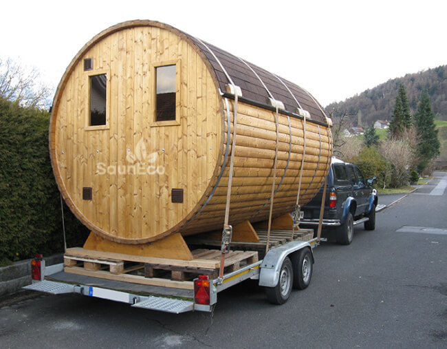 - The Wooden Barrel Sauna Lodge will be delivered with a trailer