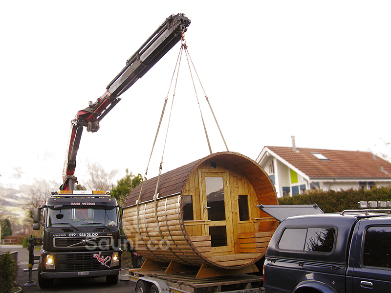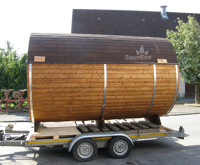 - The Wooden Barrel Sauna Lodge will be delivered with a trailer
