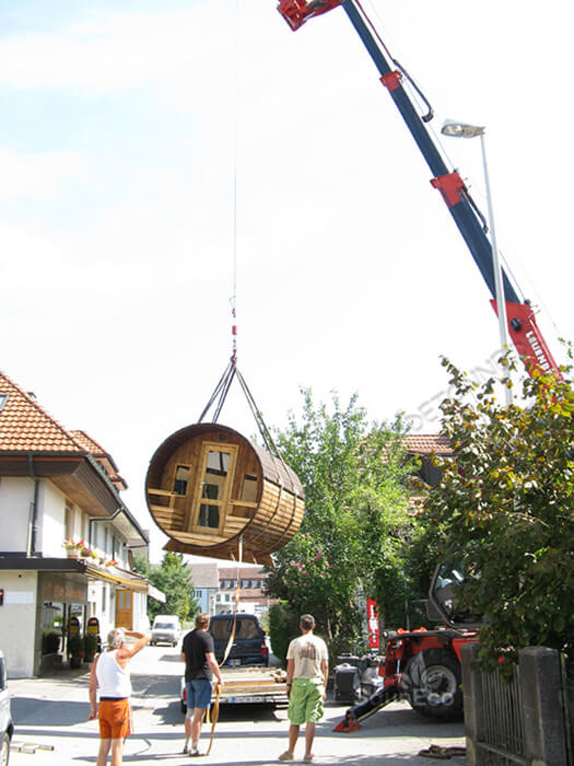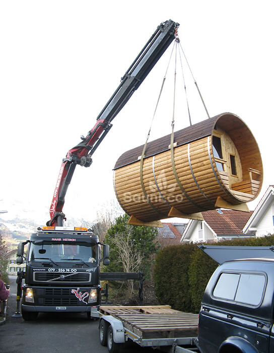 Our portable barrel saunas will be delivered with trailer and the price does not include the unloading. It is necessary to organize a forklift, tractor, crane or some other machine to unload the barrel sauna. For an additional charge we can organize the unloading and/or assembly for you.